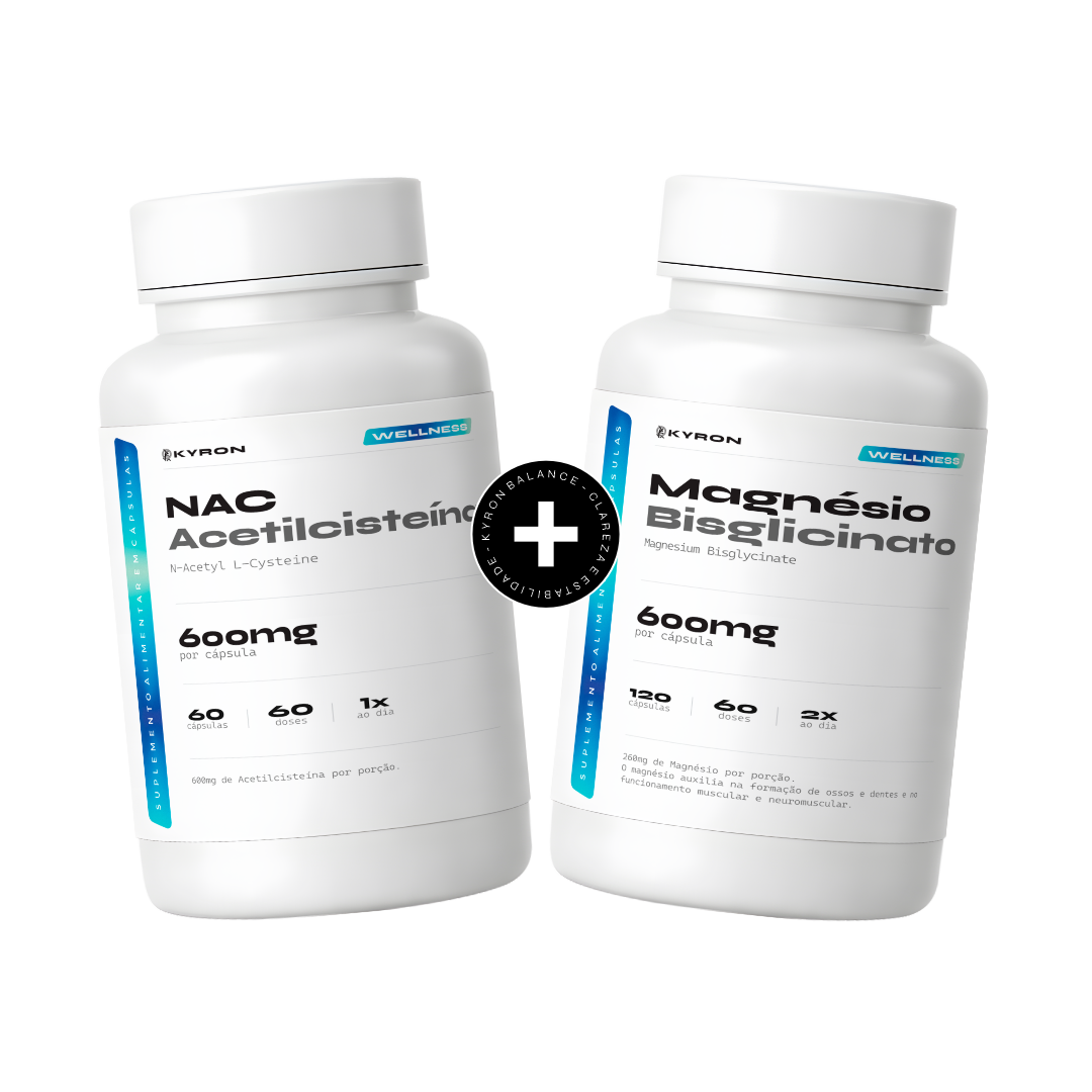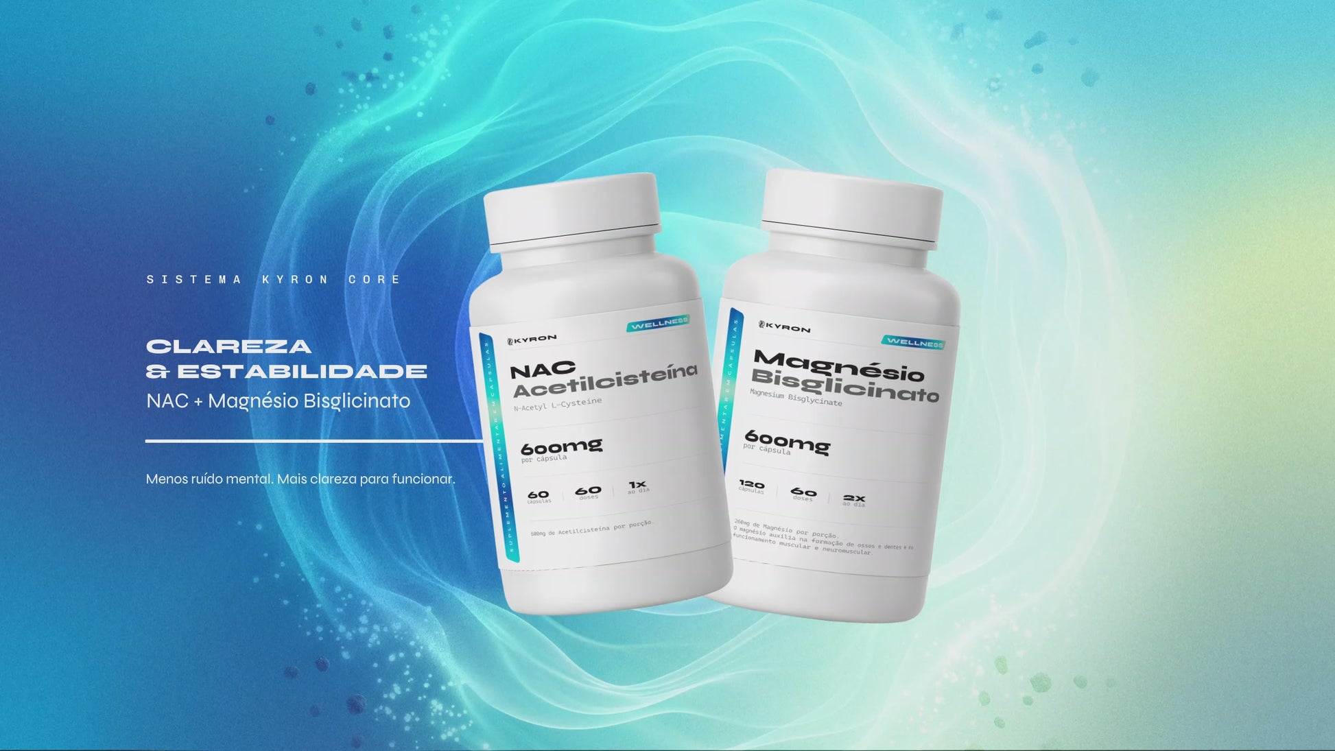 Com a combinação de NAC (N-acetilcisteína) e Magnésio Bisglicinato, o Kyron Balance atua no suporte ao equilíbrio do sistema nervoso e na redução da sobrecarga causada pela rotina intensa, ajudando a melhorar a qualidade do foco e a sensação de bem-estar.